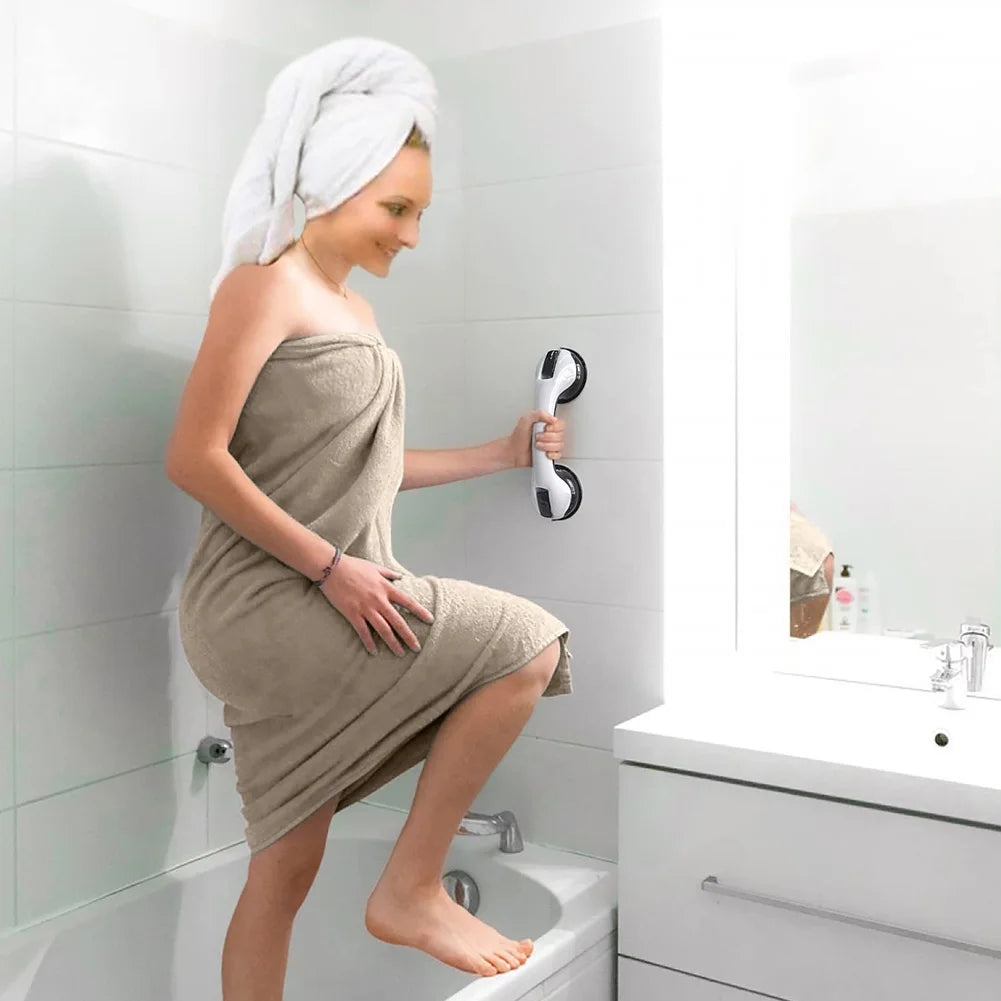A Barra de Apoio para Banheiro com Borrachas de Fixação que mantém idosos, grávidas, crianças e portadores de necessidades especiais seguros.